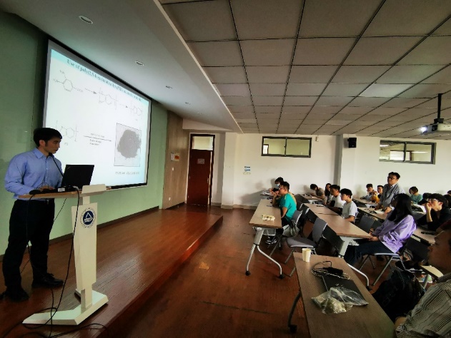 Tatsuo Kaneko教授报告主题为“Recent development of Bio-based Plastic and its bright future”。他着重介绍了生物基塑料的最新发展及其光明前景。分为以下几个部分:1、简单清晰地介绍了生物基聚合物的可控降解以及首次发现的水中的光化学反应赋予高分子材料光引发水解的能力;2、重点介绍了衣康酸基生物尼龙,基于衣康酸和二胺,通过改变聚合方法,开创了“盐类单体的本体聚合方法”,可以利用衣康酸的双羧基和双键形成吡咯烷酮环,从而得到衣康酸衍生的耐高温生物尼龙;3、还介绍了几种高性能生物塑料,其力学性能可与聚甲基丙烯酸甲酯、聚丙烯等相媲美,在生物塑料的发展具有一定的引领作用。Tatsuo Kaneko教授与钟显铸博士的报告非常详实,生动丰富,令人耳目一新,引起了在座师生的积极交流和讨论,师生们纷纷表示受益匪浅。
