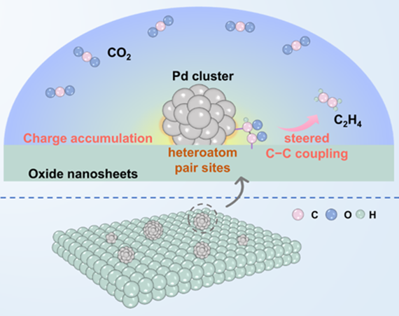 示意图1.半导体纳米片上高活性金属团簇的CO2光还原示意图,其中在界面上构建的具有不同电荷密度的杂原子对位点可以促进C−C偶联生成C2H4。