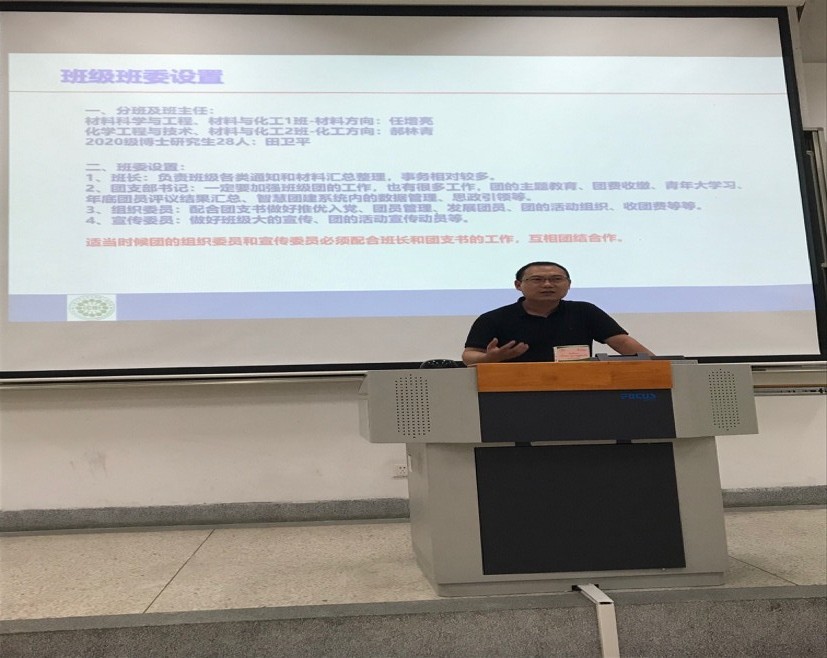 化工学院分团委书记任增亮老师为研究生新生讲解了班级班委设置。任增亮老师强调,班委要起到带头作用,关爱同学、照顾同学、引领同学,将班级建设成为一个和睦友爱,凝聚有力的大集体。