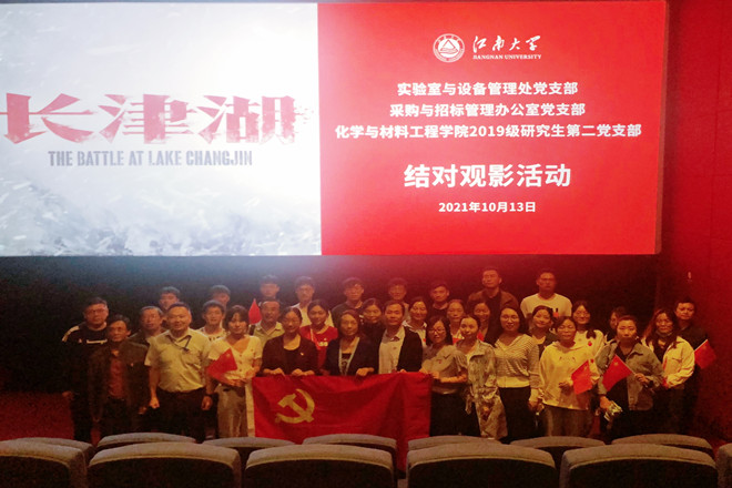 为庆祝新中国成立72周年,纪念中国人民志愿军抗美援朝战争胜利71周年,持续深入开展党史学习教育,激发师生的爱国热情,传承抗美援朝精神,赓续红色血脉,10月13日,由实验室与设备管理处党支部、采购与招标管理办公室党支部和化工学院2019级研究生第二党支部结对共建,组织观看了电影《长津湖》。