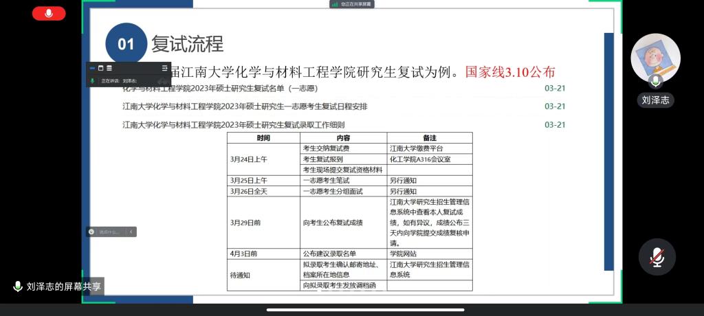 最后,江南大学的刘泽志对院校复试的分值构成进行了详细解读,同时对复录比进行了讲解和补充,行百里者半九十,他鼓励同学们一定要持之以恒,准备迎接胜利的曙光,成功上岸。