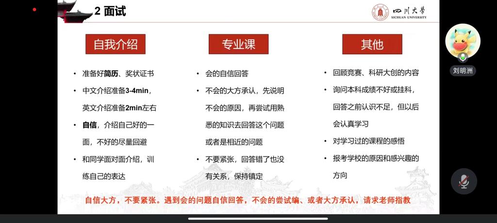 其次,四川大学的刘明洲从专业课笔试、面试和复试注意事项等方面对复试进行了详细讲解。他建议同学们要多做题,做好题,认真准备笔试;用心制作简历和自我介绍PPT,自信大方面对面试;复试期间的住宿、饮食等事项也要时刻注意,为复试做好万全准备。
