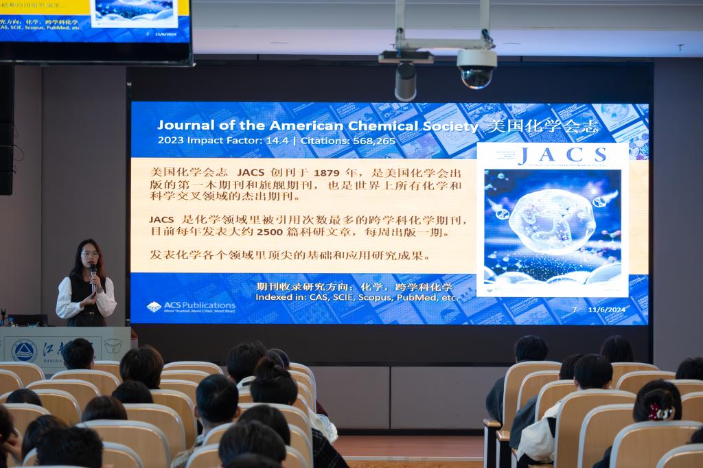 讲座聚焦于两个在化学领域具有极高权威性的数据库——ACS美国化学会数据库和CAS美国化学文摘社数据库。邀请了iGroup China公司ACS数据库资深培训师,华东师范大学教育硕士虞昊安老师和爱荷华州立大学博士、美国化学文摘社方案解决专家陈开乾博士为大家进行讲解。首先,虞昊安老师为同学们带来了关于ACS科研数据库的深度剖析。在讲解过程中,虞老师从多个维度阐述了ACS数据库的文献资源利用方法。他强调,在当今科研竞争日益激烈的环境下,充分挖掘和利用数据库中的文献资源,是科研人员把握前沿研究方向、获取创新灵感的关键所在。对于科研学术发表相关内容,虞老师不仅介绍了ACS数据库期刊的最新动态,还重点针对英语科技论文写作这一关键环节展开了细致入微的讲解。此外,虞老师还深入讲解了如何对ACS学术期刊做合理的投稿选择。他详细介绍了不同期刊的特点和偏好,帮助同学们根据自己的研究内容和水平,选择最适合的投稿渠道。在讲解过程中,虞老师还穿插了许多实际案例,使同学们更加直观地了解了学术期刊论文发表过程中的投审稿流程和同行评议知识。现场气氛热烈,同学们积极提问,虞老师都耐心解答,与同学们展开了一场热烈的学术互动。