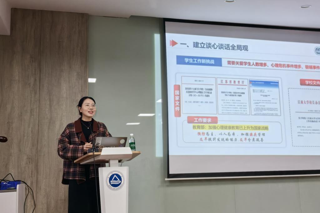 潘焱毓首先以“谈心·知心·润心”为培训主题,以班主任日常谈心谈话工作为切入点,深入讲解心理育人工作要点和方法。她表示,有效的谈心谈话需要教师提前做好环境和心态方面的准备,在谈话时要精准把握关键性指标,在谈话过程中可遵循“谈事实、谈感受、谈需要、谈行动”的四部曲方法,确保对话既深入又有效。如果评估学生可能面临困境,及时向学生提供必要的援助渠道也是不可或缺的一环。