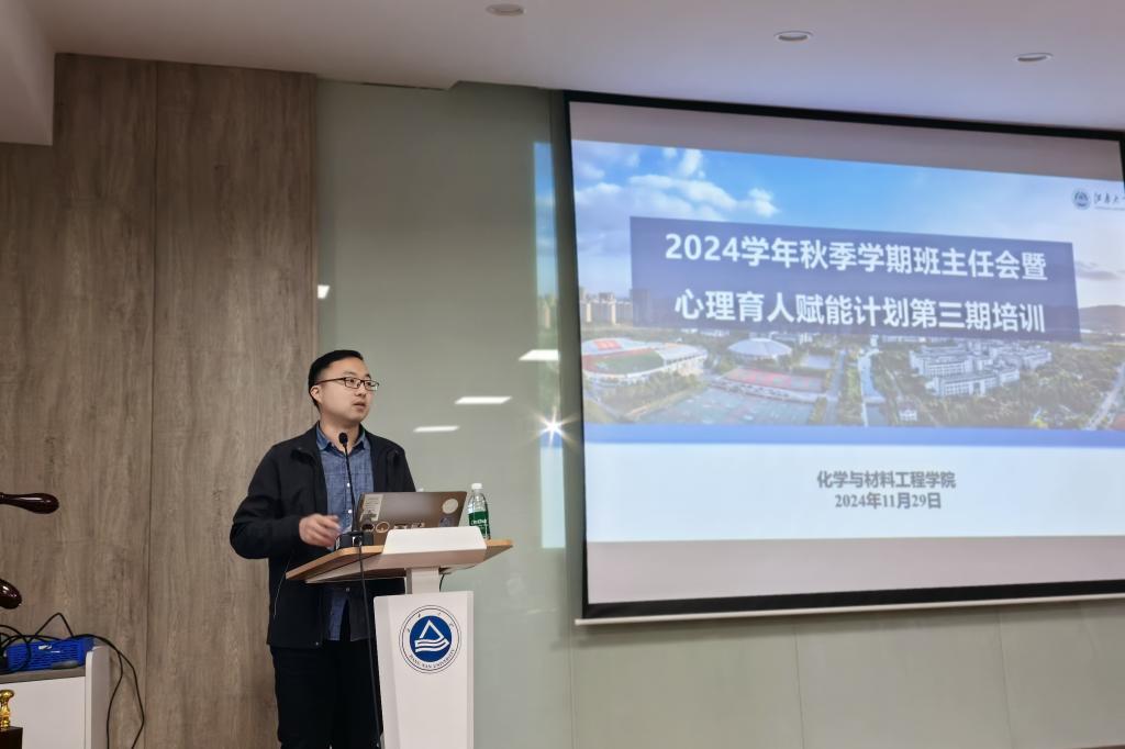 为深入推进学院心理健康教育,强化心理育人实效,提升辅导员和班主任队伍的心理育人能力,强化其理解、应对和引导学生心理发展的能力,betway中国西汉姆联官网于11月29日下午在化工楼A316会议室开展班主任工作会议暨心理育人赋能计划第三期培训。学院党委书记潘庆伟,学工办主任、分团委书记鞠峰,校心理健康教育中心专职教师潘焱毓,学院全体辅导员和班主任参加本次活动。