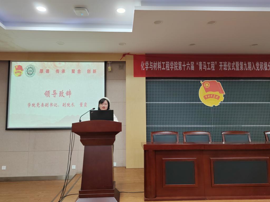 紧接着,董霞为第十六届“青马工程”培训班授旗,新学员代表高分子2402班朱思盈同学上台发言,承诺将在本次培训班中努力学习,提升自我,继续学习好、传承好、发扬好党的红色精神,努力成为一名坚定的青年马克思主义者。