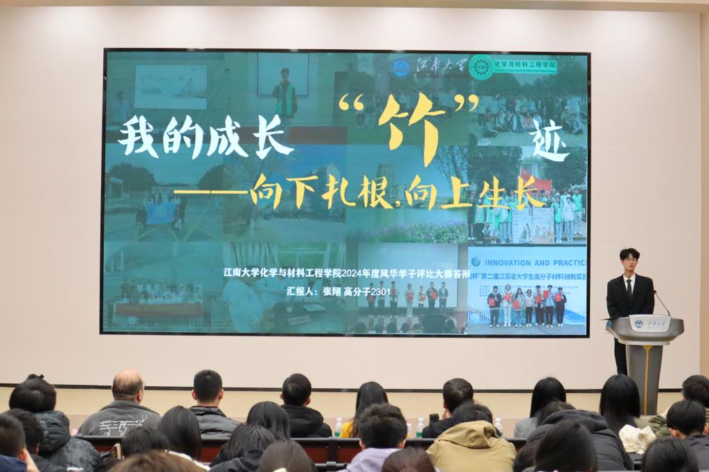 首先进行的卓汇菁英类竞选,李家豪等同学分享了他们在科研探索和党务工作中的卓越表现,展现了化院学子的理想追求与责任担当。他们的故事激励每一位在场的同学,传递勇于追梦的精神力量。在学研精进类展示中,赵伊等同学积极响应国家战略,立足科技前沿,勇于创新,在各自的领域取得丰硕成果。他们不仅展示了年轻学者追求卓越、勇攀高峰的精神风貌,还为同学们树立了学术研究的标杆。在坚毅追光类展示中,周康杰同学以其坎坷的求学经历和在科研中拼搏奋斗的故事,深刻诠释了“坚毅是拼搏的底色”。他用自己的经历勉励学弟学妹们在面对困难时保持坚定信念,勇敢向前,书写属于自己的辉煌篇章。在践行先锋类展示中,方承格等同学秉承开拓奉献的精神,积极参与学生工作和志愿服务,成为连接学院与学生的桥梁。他们不仅在日常学习生活中展现了优秀的领导和组织能力,更在实际生活中彰显了新时代青年的风采与力量。在文体风尚类竞选中,陈丹萍等同学在体育活动中表现出色,在市、校、院级比赛中取得佳绩,以拼搏进取的精神闪耀舞台。他们不仅个人成绩斐然,更带领团队屡获佳绩,摘得各级奖项。他们的表现充分展现了青年人应有的活力与激情,彰显了青春无畏、奋勇向前的精神风貌。