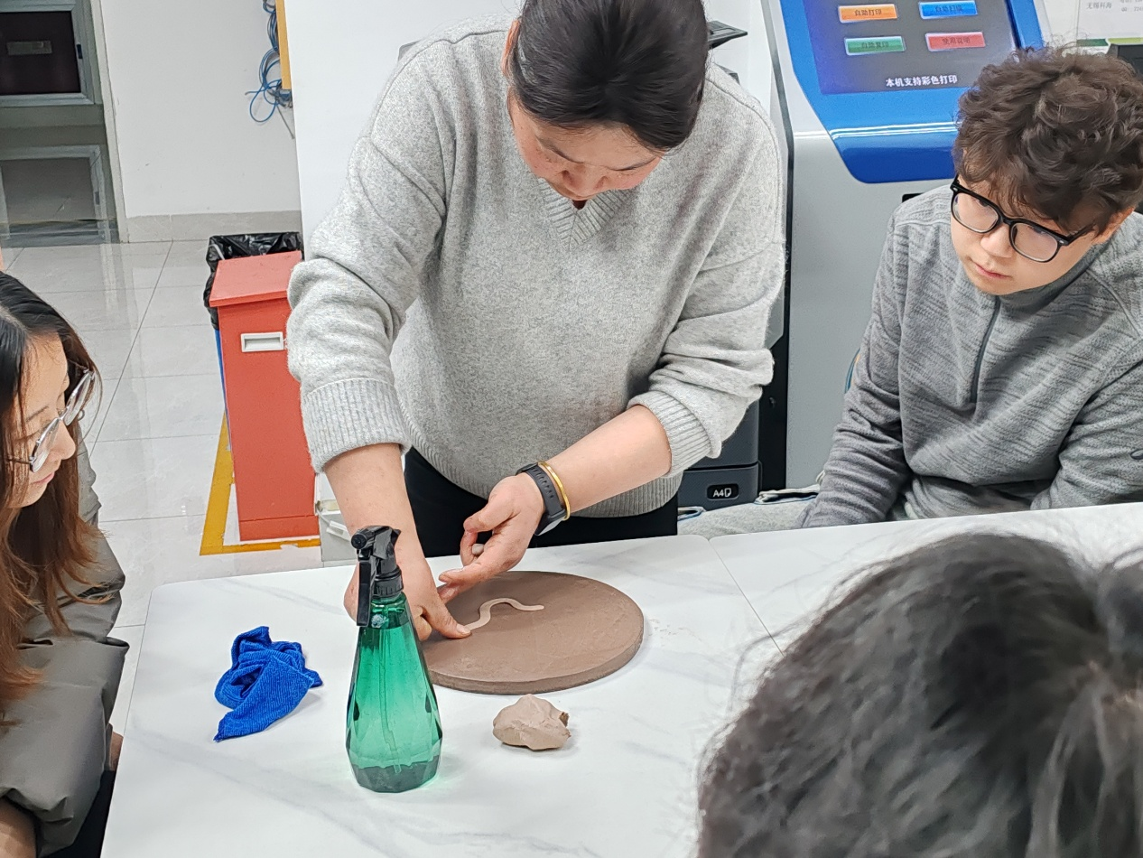 在手工陶盘制作环节,同学们亲手触摸陶土,感受其从湿润到塑形过程中的温度与质感。大家围坐一堂,一边交流制作心得,一边专注塑造手中的陶盘:有的同学以自然为题材,塑造出细腻的花草与流动的水纹;有的运用几何元素,构建出简洁而富有节奏感的装饰画面;还有的将个人情感与生活印记融入创作,使陶盘成为承载故事的独特载体。现场气氛融洽温馨,陶土在指尖慢慢“活”了起来,每一件即将成型的陶盘都凝聚着同学们的巧思与匠心。