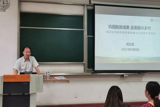 课上,顾正彪副校长结合我校参与脱贫攻坚工作取得的经验、成果,阐述了脱贫攻坚的中国经验和振兴乡村的中国探索,详略得当地概括了我国扶贫开发的历史进程,讲解精准扶贫中必须解决的“扶持谁”“谁来扶”“怎么扶”以及“如何退”四个关键问题。讲述党和国家如何通过制定一系列的方针政策克服重重困难来实现 “全面脱贫”的伟大目标,引出了他对学生们在今后学习工作中的三点寄语:一是勤于思考,勇于创新提出举措;二是明确目标,满怀自信为之奋斗;三是脚踏实地,不务空名落实政策。在课程临近结尾,顾正彪副校长再次以“全面脱贫”伟大事业为例,强调“同学们一定要坚决拥护并理解领会国家的各项方针政策,正面看待政府为实现目标所采取的各项举措”。