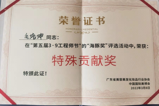 近日,中国国际美博会主办的“激流2022——第5届3.9工程师节暨海豚奖颁奖盛典”在广州举行,会上,我院老教授毛培坤荣获“海豚奖”最高级别奖项——“特殊贡献奖”,成为我院第二位获此最高荣誉的教师。