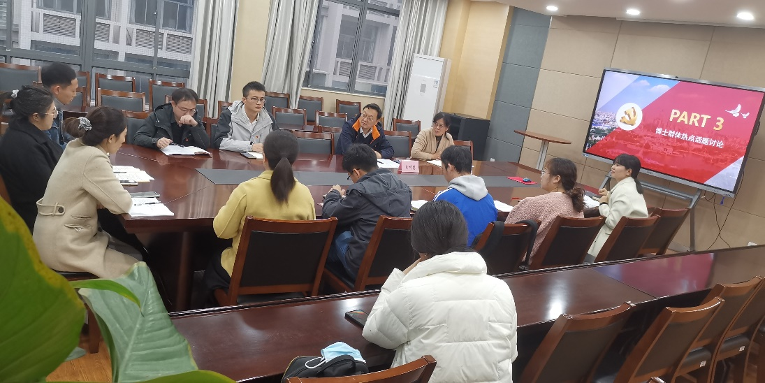 习近平总书记在《二十大报告》中还提到,目前国家科技创新能力还不强,且现在城镇新增就业年均在1300人以上,这些情况与研究生群体也是息息相关的,因此支部各党员同志围绕“科研压力”“就业压力”以及“如何放平心态,停止焦虑”等话题展开了热议。