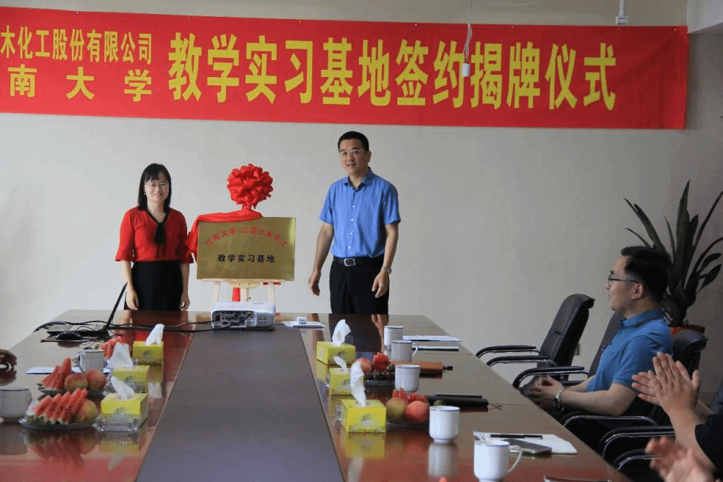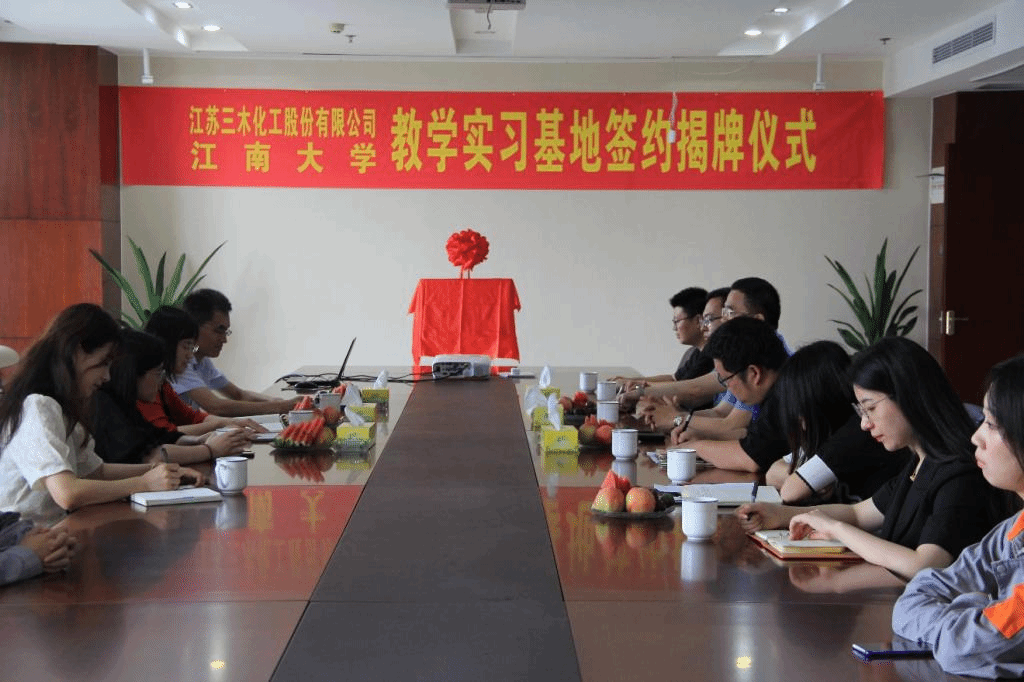 为深入学习贯彻习近平新时代中国特色社会主义思想主题教育,全面落实江南大学东氿校区人才培养和校企合作新举措,6月26日,学院与江苏三木化工股份有限公司共建签约暨教学实习基地揭牌仪式在江苏三木化工有限公司举行,企业总经理薛中群,技术副总惠正权,人力资源部部长曹梨松,学院党委副书记、副院长董霞,副教授、宜兴市科技镇长团团员刘敬成,材料系主任罗静,辅导员李晓洁及13名实习学生参加活动。本次活动由刘敬成主持。