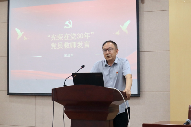 在中国共产党建党102周年来临之际,为致敬与党走过风雨历程、赓续党的光荣传统的老党员同志,院党委书记潘庆伟为我院党龄超过三十年的党员同志颁发“光荣在党30年”荣誉证书。宋启军教授作为老党员代表发言,他指出,党员要传承“螺丝钉”精神,坚守教育初心,做好本职工作。作为教师,宋老师坚守讲台三十余年,“0旷课0迟到”,保质保量完成教学任务;他坚守科研底线,遵循基本的学术规范,追求高标准的育人水平。宋老师强调,坚守底线,做好本职,这是党员的最低标准,也是最高要求。