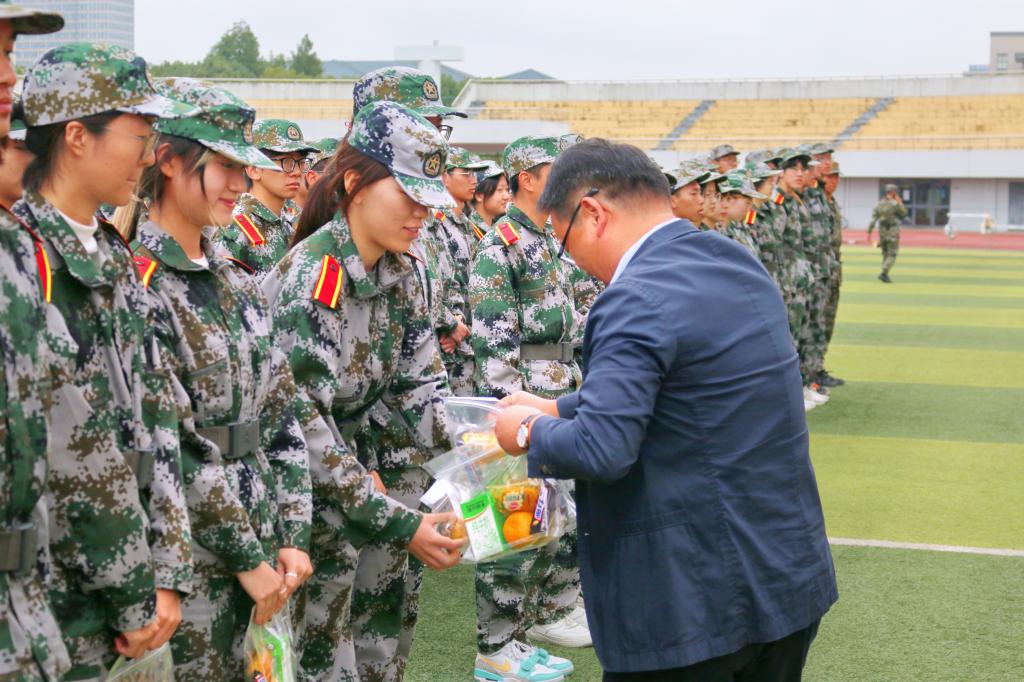 成果展示之后,潘书记进行讲话。他首先对承训教官表示感谢,对2022级学生的精神面貌给予肯定和赞扬。他指出,2022级学生虽然已经在校学习一年,但精神上仍不能放松,应继续保持朝气蓬勃的精气神,努力奋发,认真完成好每一项任务,扎实走好每一步。同时,他号召同学们要了解军人,致敬军人,践行“听党指挥、能打胜仗、作风优良”的队伍建设要求,传承“召之即来、来之能战、战之必胜”的军人意志,铸就精神钢铁长城。讲话结束后,学院领导老师为参训学生发放慰问品。