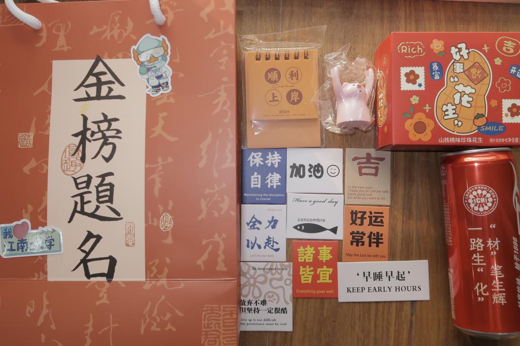 随后,潘庆伟、董霞及各班班主任为考研学生分发“考研加油能量包”。能量包中包括印有“化育天工”印章的专属明信片、江南化工人定制可乐、考研上岸日历、“考研加油”桌面摆件、“好事发生”零食花生等蕴含祝福的礼品。每一份礼品都满含着学院最真挚的期许与关怀。现场的同学们纷纷表示,来自学院的暖意让他们深受感动,更加坚定了他们考研的决心和信心。