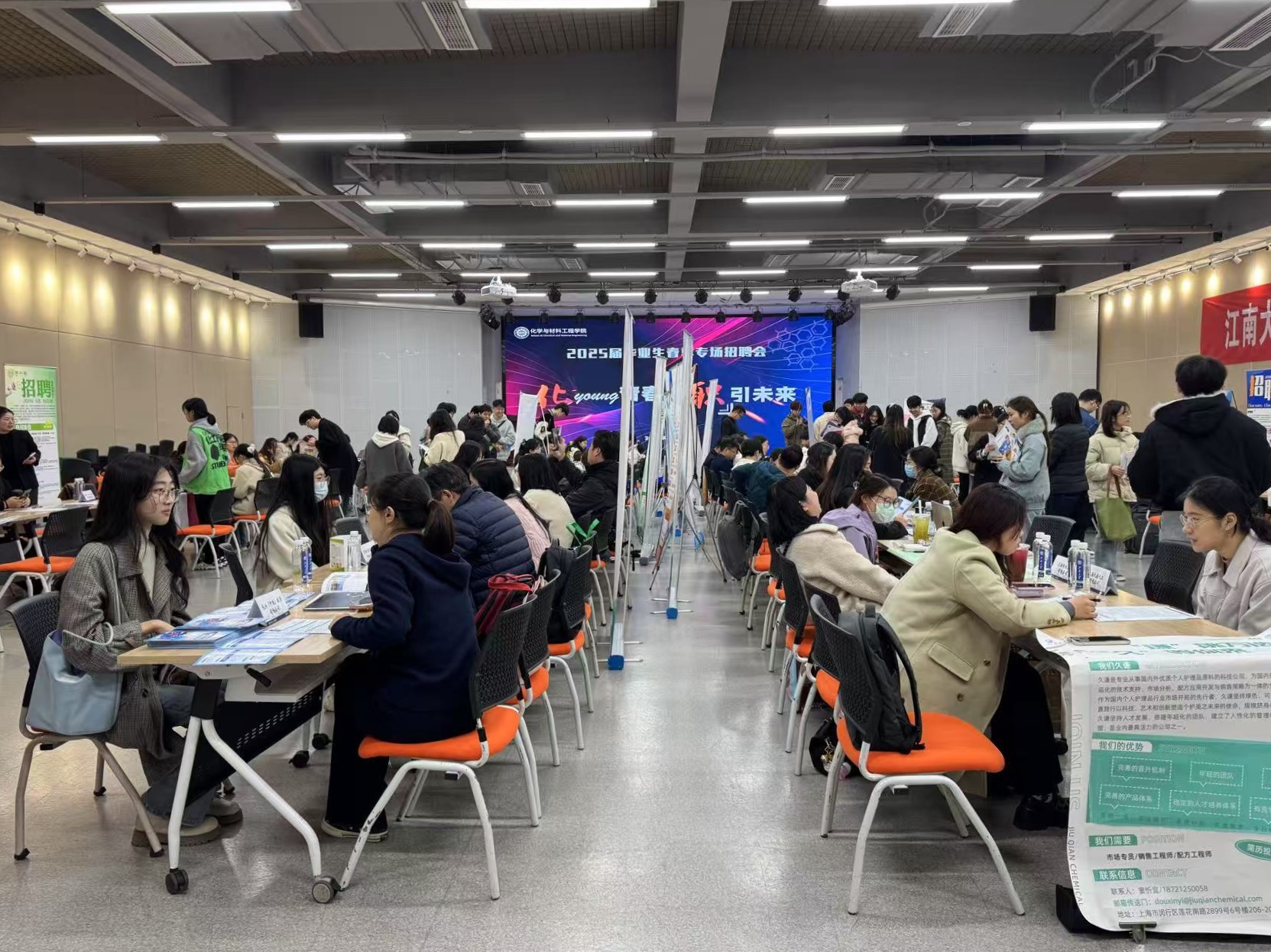 本次招聘会共设展位48个,吸引了多家优质企业参会,提供涵盖应用胶体与界面化学、化妆品、催化新技术、功能材料、高分子材料和涂层材料等领域的岗位300余个,招聘专业涉及应用化学、高分子材料与工程、化学工程与工艺、材料科学与工程、材料工程、化学工程与技术、化学工程、材料化学,吸引了学院200余名学生到场咨询应聘,现场气氛热烈。