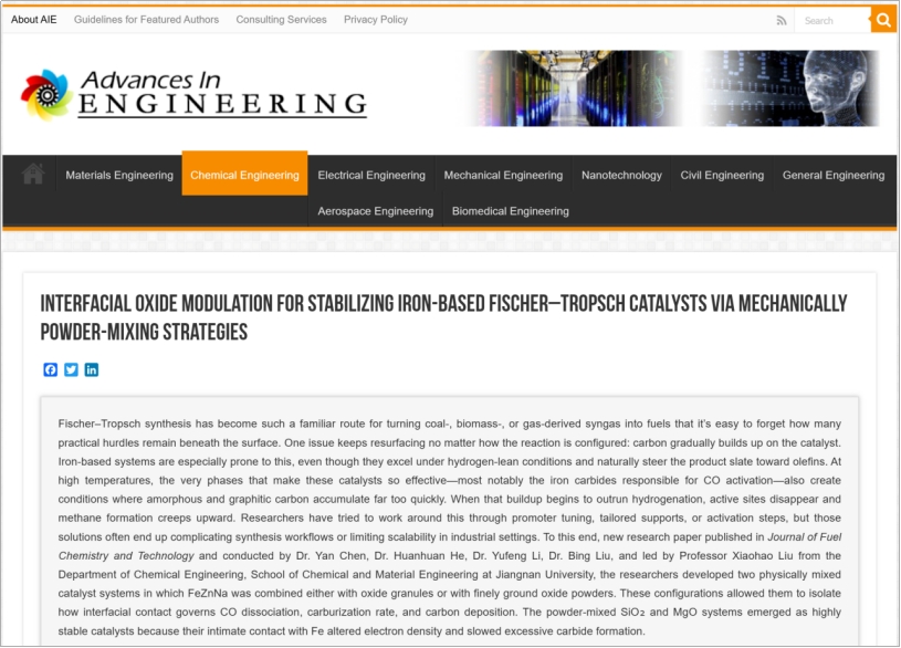 近日,江南大学刘小浩教授课题组以最简便的“机械混合”策略构建“氧化物-费托催化剂界面,Oxide-FTCat Interface”调控合成气铁基费托合成反应稳定性的研究成果“Study on the regulation of Fischer-Tropsch synthesis catalytic performance by mixing oxides with iron-based catalysts” inJournal of Fuel Chemistry and Technology,2025, 53(8), 1212–1222”被国际工程领域著名科技机构Advances in Engineering(简称为AIE)遴选为通用工程领域关键科学文章,并以“Interfacial Oxide Modulation for Stabilizing Iron-Based Fischer–Tropsch Catalysts viaMechanicallyPowder-Mixing Strategies”为题进行了重点专题报道。