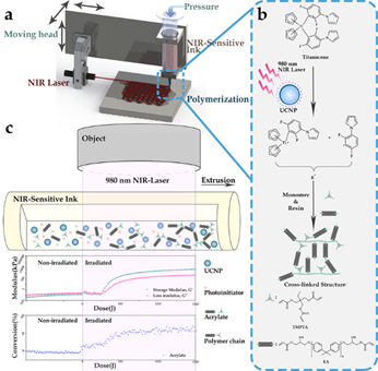 在中国制造创新版图上,3D打印(也称增材制造)作为核心技术之一,正从航空航天、汽车电子、军事国防、生物医疗等方面全面推进相关发展。“材料-结构-制造-功能”的一体化制造概念成为我国智能制造发展的重要方向,材料与制造的相辅相成已为主要趋势。当新型感光材料与3D打印技术在我校的相遇,直接带来了相关方向的重要技术突破。我校betway中国西汉姆联官网刘仁教授团队长期致力于光聚合基础及其在涂料、微电子和3D打印领域的应用技术研究;机械工程学院刘禹教授团队主要开展3D打印工艺与机电装备技术研究。双方团队联合攻关,基于近红外激发上转换粒子原位发射紫外-可见光的策略,设计了全新的3D打印材料,并在自主设计的工艺装备上,率先建立近红外辅助3D墨水直写技术,实现了多色彩材料、跨尺度(3个量级制造分辨率)、无支撑的3D打印,打破了传统三维成形方法的材料局限性与制造精度局限性,有望加速3D打印技术在柔性传感、软体机器人与生物医疗领域的应用。