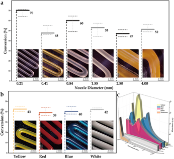 图2 不同特征尺寸(a)及不同色彩(b)的结构与转化率分析;c.颜料紫外可见吸收光谱对比