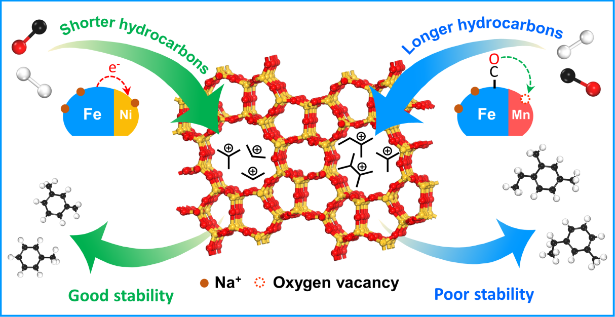 费托合成是将合成气(H2/CO/CO2)直接转化为超清洁燃料和高价值化学品的重要技术途径。铁基催化剂是常用的费托合成催化剂,它与烃类产物在HZSM-5上催化转化为芳烃具有相匹配的反应条件,这为将两种催化剂耦合在单反应器中一步催化合成气转化制芳烃成为可能。然而,这两类催化剂在固定床反应器中均容易失活,且反应过程极其多样复杂、难于控制,这使得合成气(CO/H2)在单反应器中一步高效制芳烃极具挑战。江南大学刘小浩团队创造性地构建Na调节的Fe-Ni双金属费托催化剂用于这一催化过程,同时解决了两类催化剂(金属与分子筛)的稳定性和选择性存在的问题(图2)。