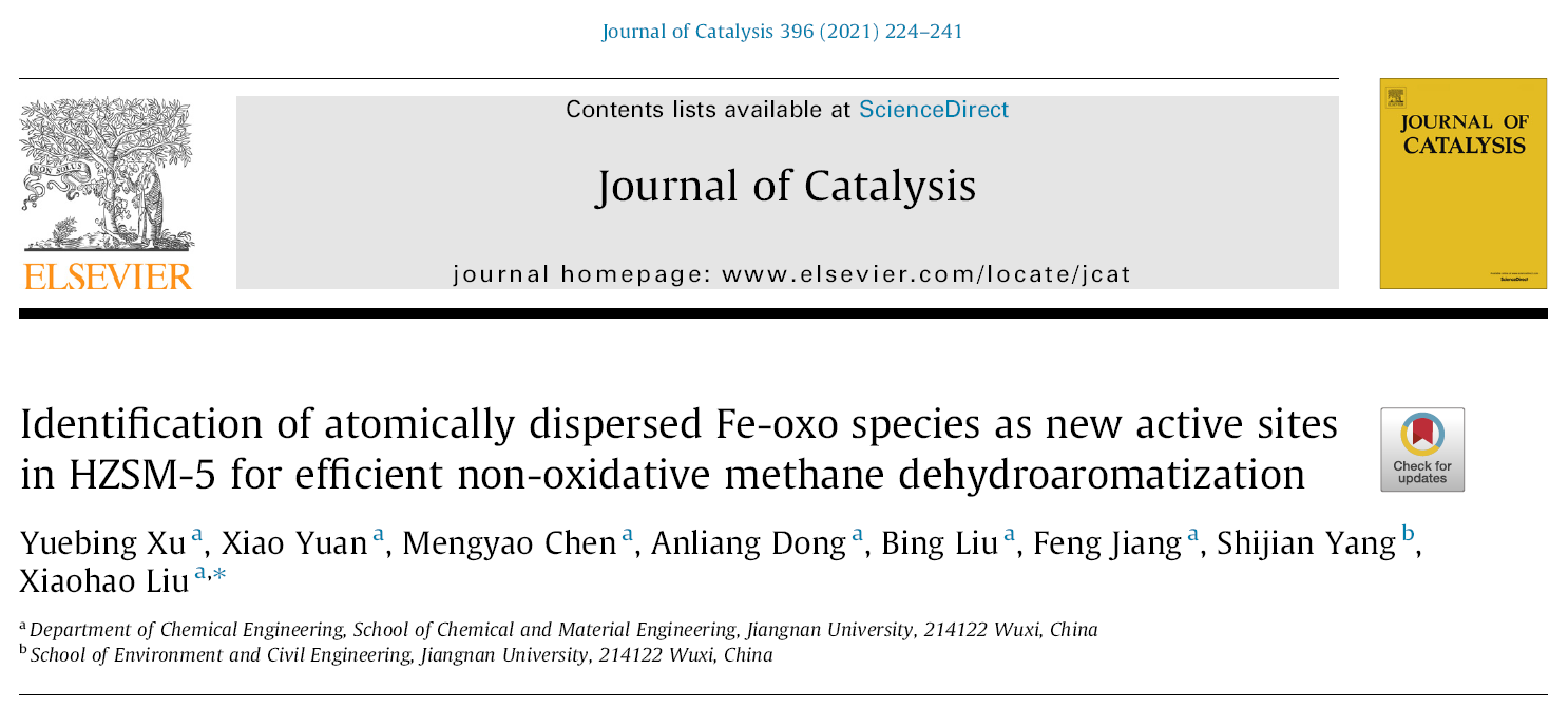 近日,我校化工学院刘小浩教授团队在揭示甲烷无氧催化转化制芳烃的新的活性中心的研究中取得重要进展,研究成果以题为“Identification of atomically dispersed Fe-oxo species as new active sites in HZSM-5 for efficient non-oxidative methane dehydroaromatization”发表在催化领域权威期刊《Journal of Catalysis》(J. Catal.,2021,396, 224-241)。该论文化工学院胥月兵副教授为第一作者,刘小浩教授为通讯作者。
