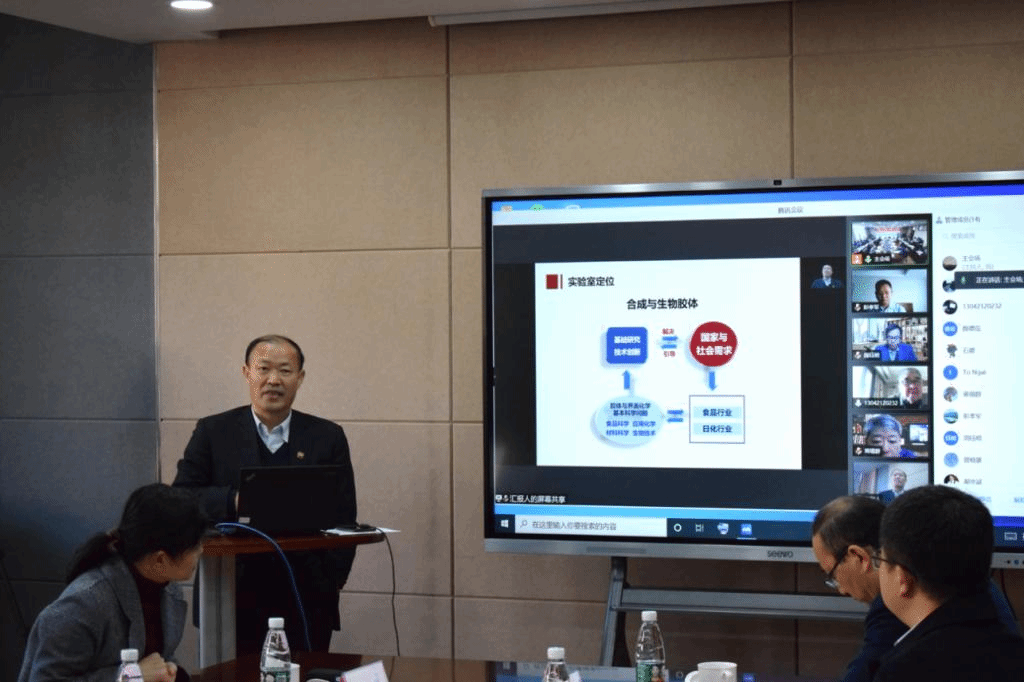 会议由学术委员会主任石碧院士和江南大学科学技术研究院院长范大明教授主持。江南大学副校长、实验室主任顾正彪教授首先做2021年度工作报告,介绍了实验室概况、年度亮点工作及各项工作所取得的进展等。随后,蒋建中教授、钟芳教授和杨成教授代表实验室三个研究方向分别做了题为“智能型表面活性剂的分子设计、合成与应用”、“脂溶性营养素的递送及其生物利用率研究”和“新型化妆品运载体系的构建”三个学术报告。与会专家认真听取了报告,并对重点实验室在基础研究、人才培养、队伍建设、成果转化、学术交流与合作等方面的工作进行了细致深入的讨论。