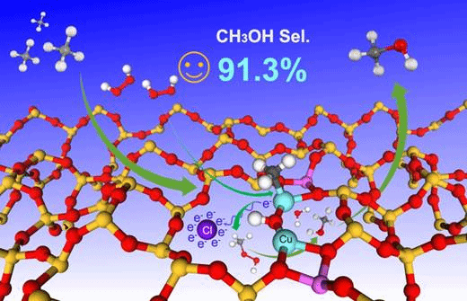近年来,甲烷低温氧化直接制甲醇引起了学术界广泛的兴趣。采用H2O2作氧化剂,Fe-ZSM-5催化甲烷低温液相氧化制甲醇是常用的催化反应体系。该催化体系的主要缺点是反应过程为羟基自由基(·OH)机理(Fe活性中心能将H2O2分解为·OH),导致反应中间物种和目标产物容易过度氧化生成不期望的副产物如甲醛、甲酸和CO2等。为了解决甲醇产物过度氧化的问题,几个课题组尝试了采用各种各样的方法来减缓·OH的释放速度或捕获溶液中过量的·OH,从而避免其过度氧化。文献报道引入Cu2+或Cu clusters等铜物种能明显提高甲醇的选择性,由于其能消耗溶液中存在的过量·OH,但催化活性显著下降。基于此实验现象,研究人员普遍认为Cu物种在H2O2作氧化剂的低温氧化体系中没有催化活性。