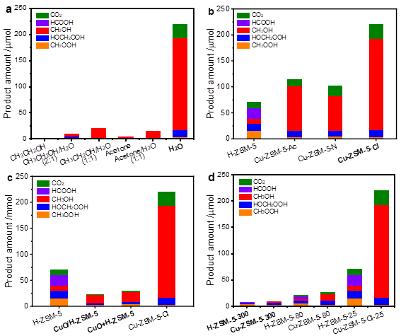 2.溶剂水(a)、氯(b)和铜物种状态(c,d)对甲烷低温H2O2氧化制甲醇的反应性能的影响