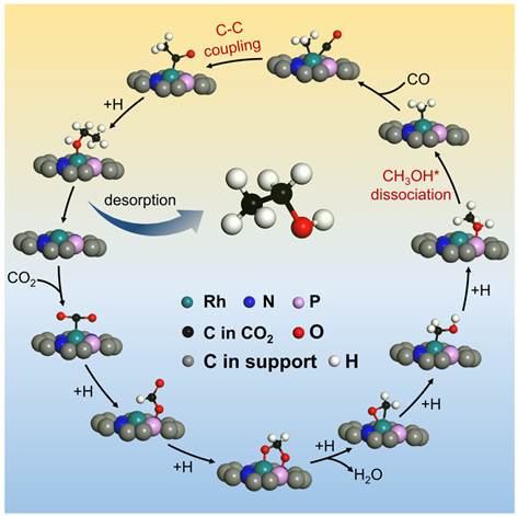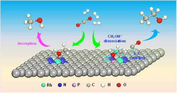 实验、表征和理论计算结果表明:(1)Rh-N3P1位点在催化CO2加氢制乙醇的反应中具有优异的催化性能(TOF=420.7 h-1),优于绝大多数文献报道结果。(2)Rh-N4位点对甲醇表现出高选择性(91.3%),通过简单的磷取代(Rh-N3P1)不但大幅增加了反应活性,而且实现了反应产物从甲醇到乙醇(81.8%)的可切换合成。(3)Rh-N3P1位点上优异的CO2反应活性和乙醇选择性可归因于Rh-P位点对的存在,其中P原子对CH3OH*中的O原子表现出强亲和力,P的强给电子能力削弱了C-O键,有利于CH3*的形成以及随后的CH3*和CO*之间的C-C偶联形成乙醇。相比较而言,Rh-N4位点难以有效活化解离C-O键,因此产物以甲醇为主。本工作为CO2加氢高活性、高选择性合成乙醇提出了全新的位对(Site Pair)催化体系,强化了双位点之间的协同催化作用,为指导设计其它高效位点对催化体系,从而解决反应过程中存在的问题提供了新的思路。