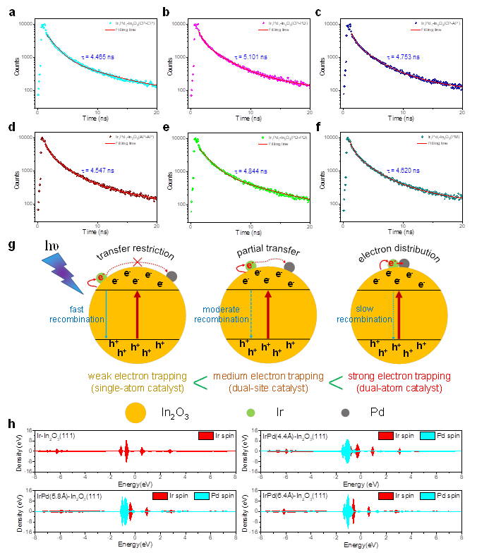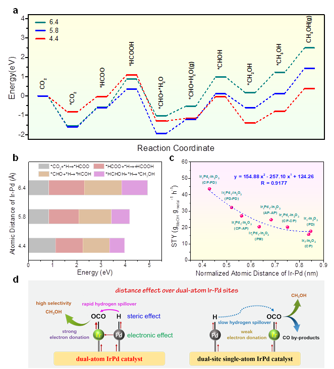 实验结果表明:采用这种光诱导靶向邻近沉积策略,在ln2O3上精确合成双原子Ir1Pd1位点用于CO2加氢制甲醇,双原子位点之间的协同催化作用显著提高了CO2转化率(10.5%)和甲醇选择性(97%),实现了破纪录的甲醇时空产率(187.1 gMeOH·gmetal-1·h-1),且活性位点与ln2O3载体之间存在合金效应,导致该催化剂具有良好的催化稳定性。