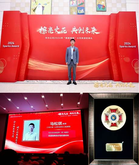 4月12日,华为技术有限公司2024年“难题揭榜”火花奖颁奖典礼在深圳华为总部举行。江南大学betway中国西汉姆联官网马松琪教授针对材料领域难题第一期-难题6“高透明高色彩饱和度材料”,从高分子结构设计与合成的角度,提出了有效解决方案,因该研究及方案具有较高价值,获得华为火花奖,并受邀参加了此次颁奖典礼。这是华为设立“难题揭榜”火花奖以来,江南大学首次获得“火花奖”。