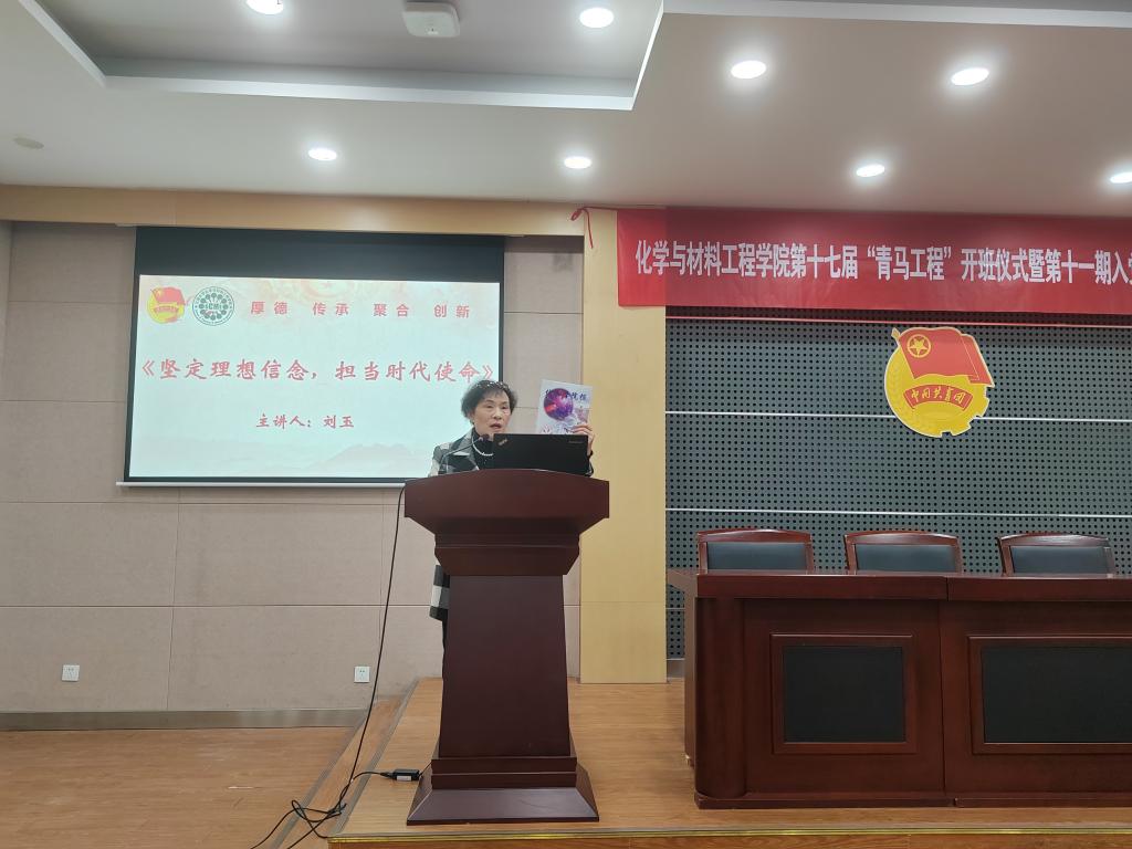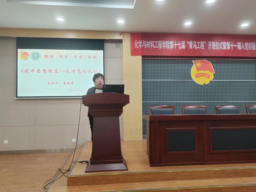 开班仪式结束后,首期培训课程同步开讲。刘玉以《坚定理想信念,担当时代使命》为题授课,她援引往届校友秉持“今天我以化工学院为荣,明天化工学院以我为耀”的赤子情怀,以榜样力量带动学院学风蔚然向上的鲜活事迹,激励全体学员要系好“人生第一粒扣子”,在求学路上铸魂求真、在成长途中激励奋进、在实践之中力行笃行、在逐梦征程敢为人先,以青春之志扛起时代之责。曹维蓓以《筑牢思想根基—谈对党的认识》为题展开分享,她深情回溯了中国共产党波澜壮阔的创建历程,深刻阐释了党的诞生作为“开天辟地的大事变”的历史必然与深远意义,强调党始终是中国革命、建设和改革事业中坚不可摧的“中流砥柱”。她寄语学员,要自觉传承和发扬党的优良传统与作风,深刻领悟“两个维护”的核心要义,不断增强“四个自信”,将个人理想融入国家发展与民族复兴的伟大征程,以青春之我、奋斗之我,为实现中华民族伟大复兴的中国梦贡献磅礴的青年力量。