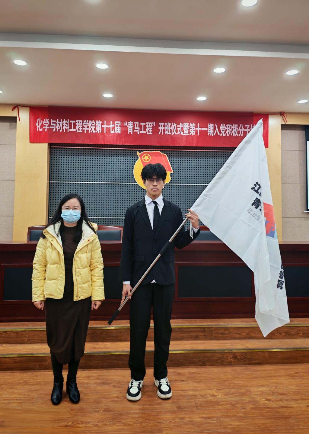 董霞为第十七届“青马工程”培训班授旗,新学员代表应化2501班孟祥科上台发言,表态将以此次培训为契机,潜心钻研、锤炼本领,深耕党的红色基因与精神谱系,做到学思用贯通、知信行统一,以坚定的理想信念、扎实的理论素养,践行青年担当,努力成长为一名信仰坚定、勇担使命的青年马克思主义者。